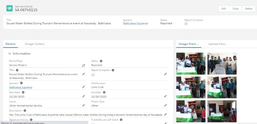 The Lions Club of Batticaloa Supreme have issued 500nos water bottles during today's tsunami remembrance day at Nawalady