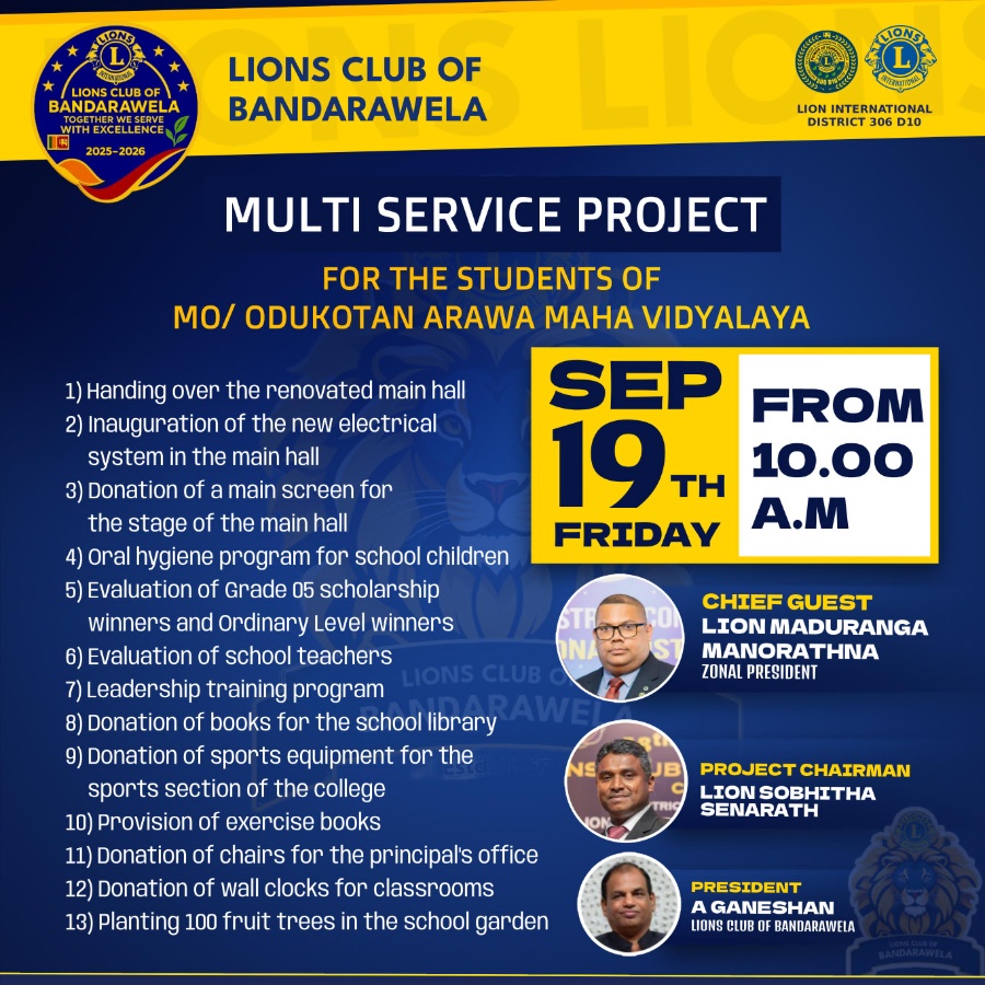 Multi-Service Project at MO/Odukotan Arawa Maha Vidyalaya Badalkumbura The Lions Club of Bandarawela successfully carried out a remarkable Multi-Service Project on 19th September 2025 at MO/Odukotan A...