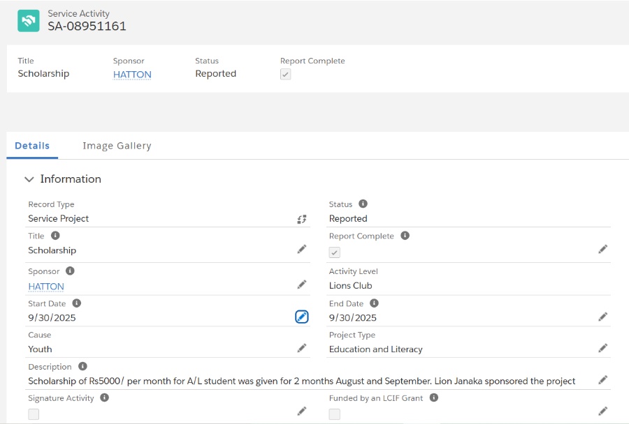 Lion Janaka provided a Scholarship of Rs. 5000/- each month to an A/l student of Sri Pada College, Hatton. This month he donated Rs.10000 for the month of August and September 2025